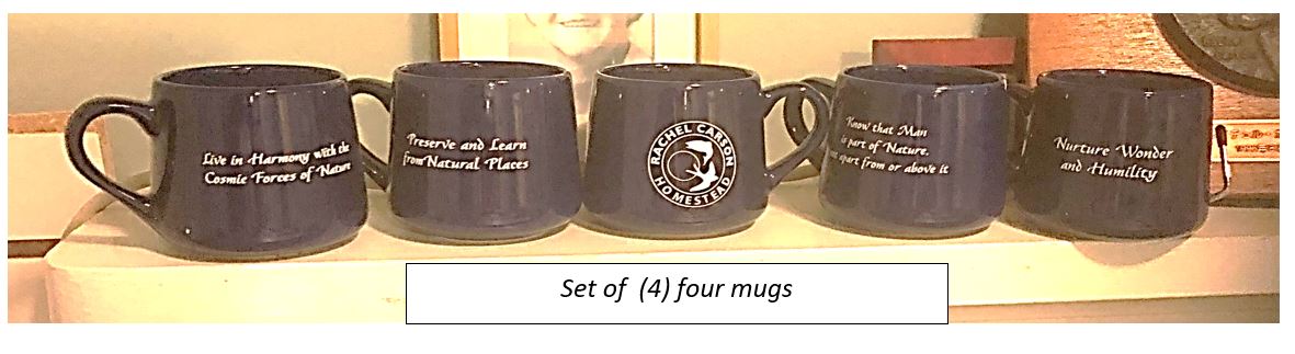 And, we again offer custom mugs. These are newly-designed and made in the US – as close as we can get to buying local to reduce shipping pollution. Each mug includes script with one of four aspects of Rachel Carson’s ethic, and the RCH logo on the opposite side.